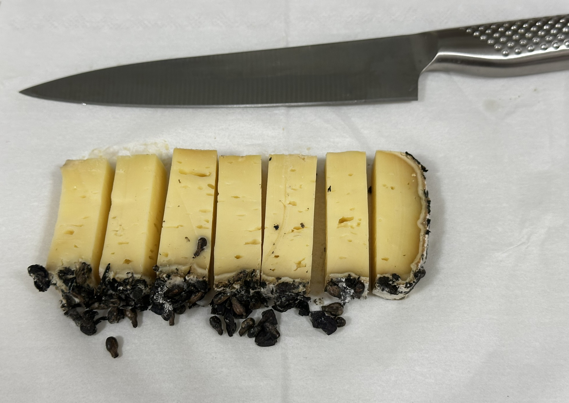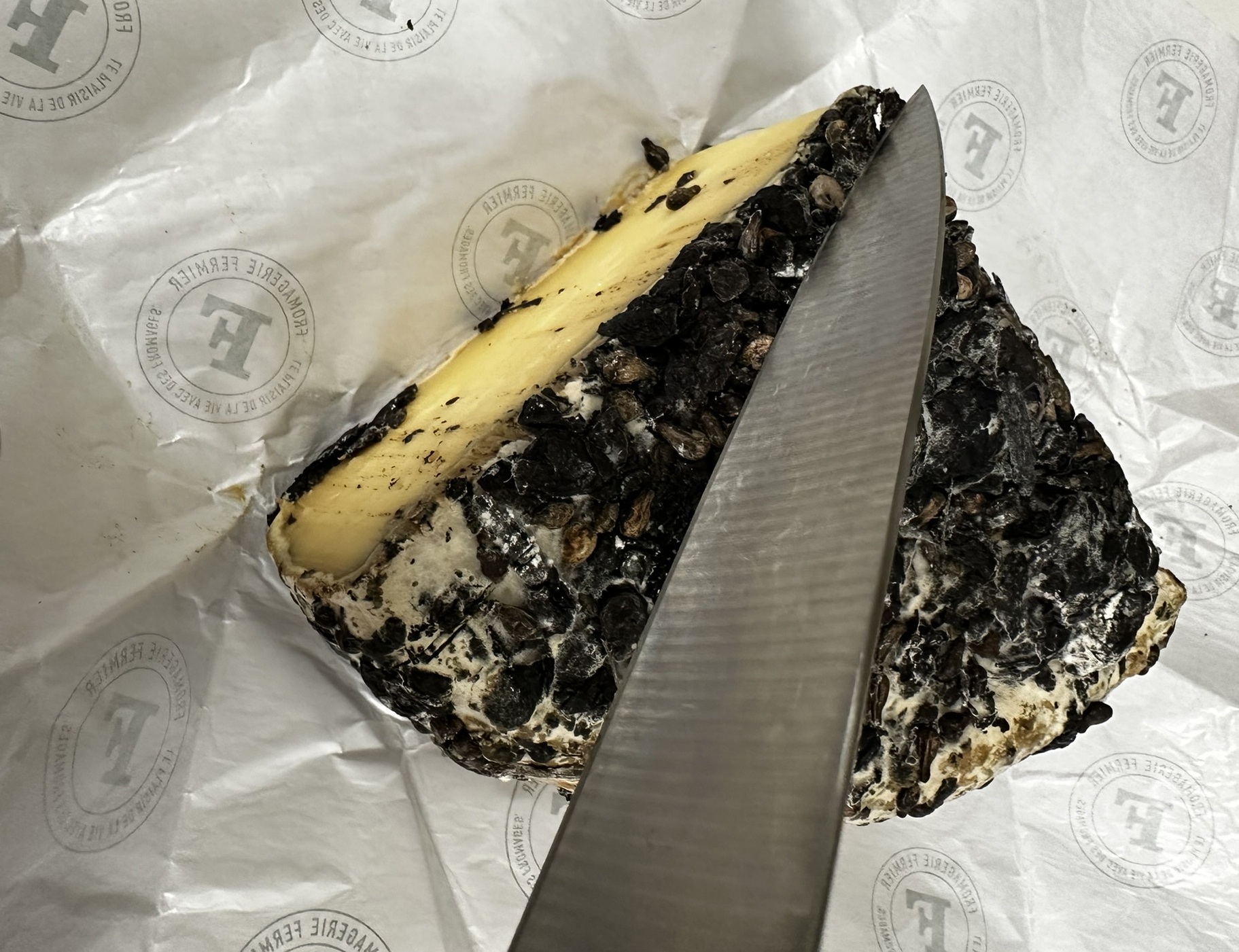 ナイフを入れると、美しい象牙色のチーズが現れます。