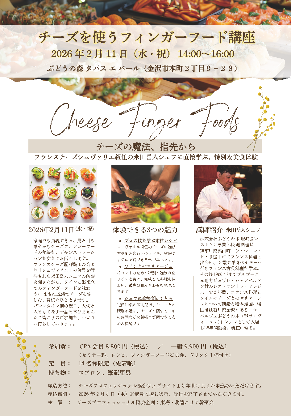 また、昨年好評だった、フランスチーズシュヴァリエ・米田シェフによる「チーズフィンガーフード教室」を、今年2月11日(水・祝)に再び開催いたします。