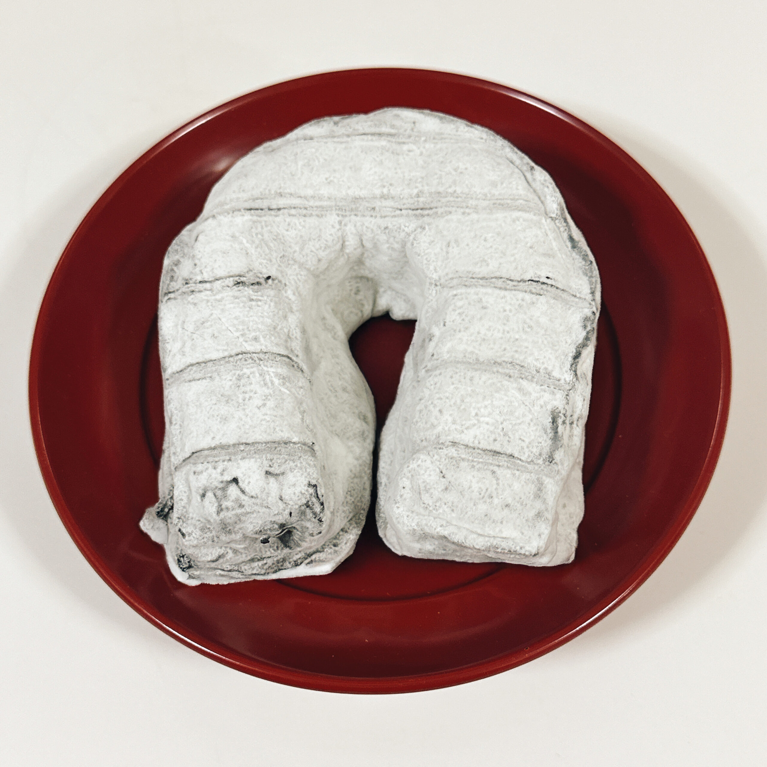 昨年11月に、真っ白な白カビチーズ『白霞(しらがすみ)』をご紹介しましたが、この『勝馬蹄』は同じ生地を使い、幸せを運ぶと言われる馬のひづめ「蹄鉄(ていてつ)」の形に整え、周りに竹炭をまぶして熟成させたものなんです。