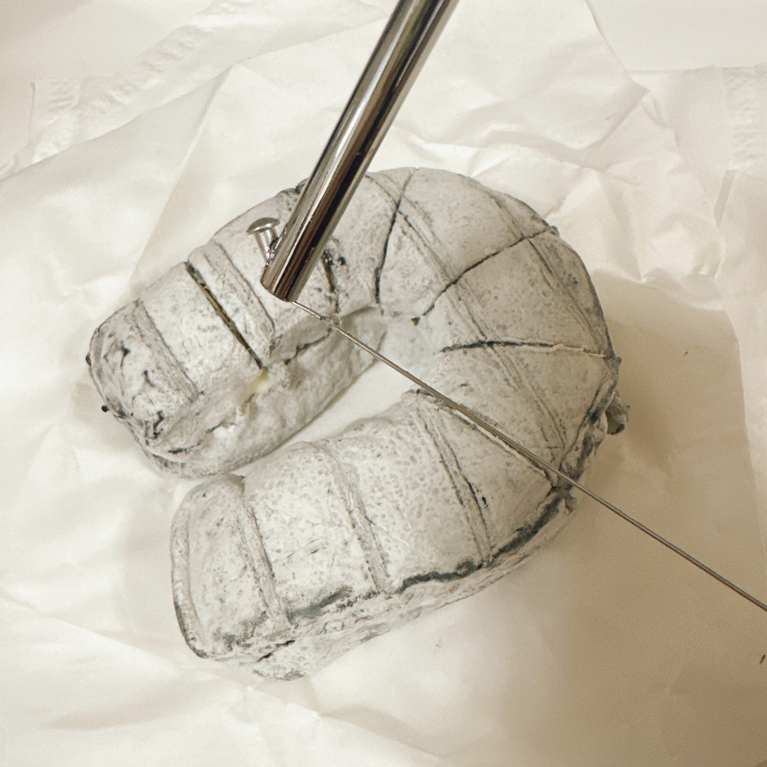竹炭をまとった真っ黒な姿をカットすると、中からは驚くほどきめ細かく、真っ白な生地が現れます。